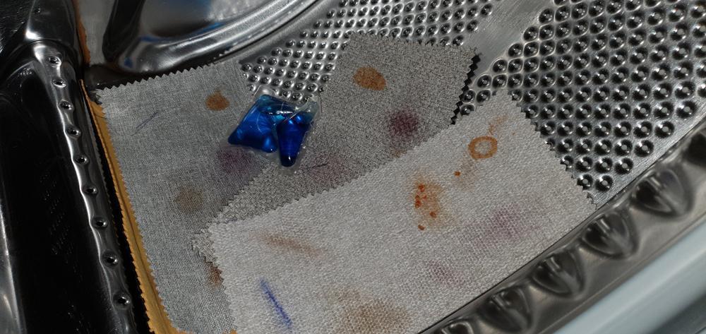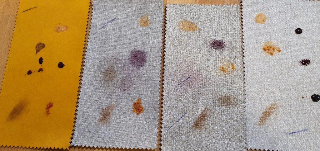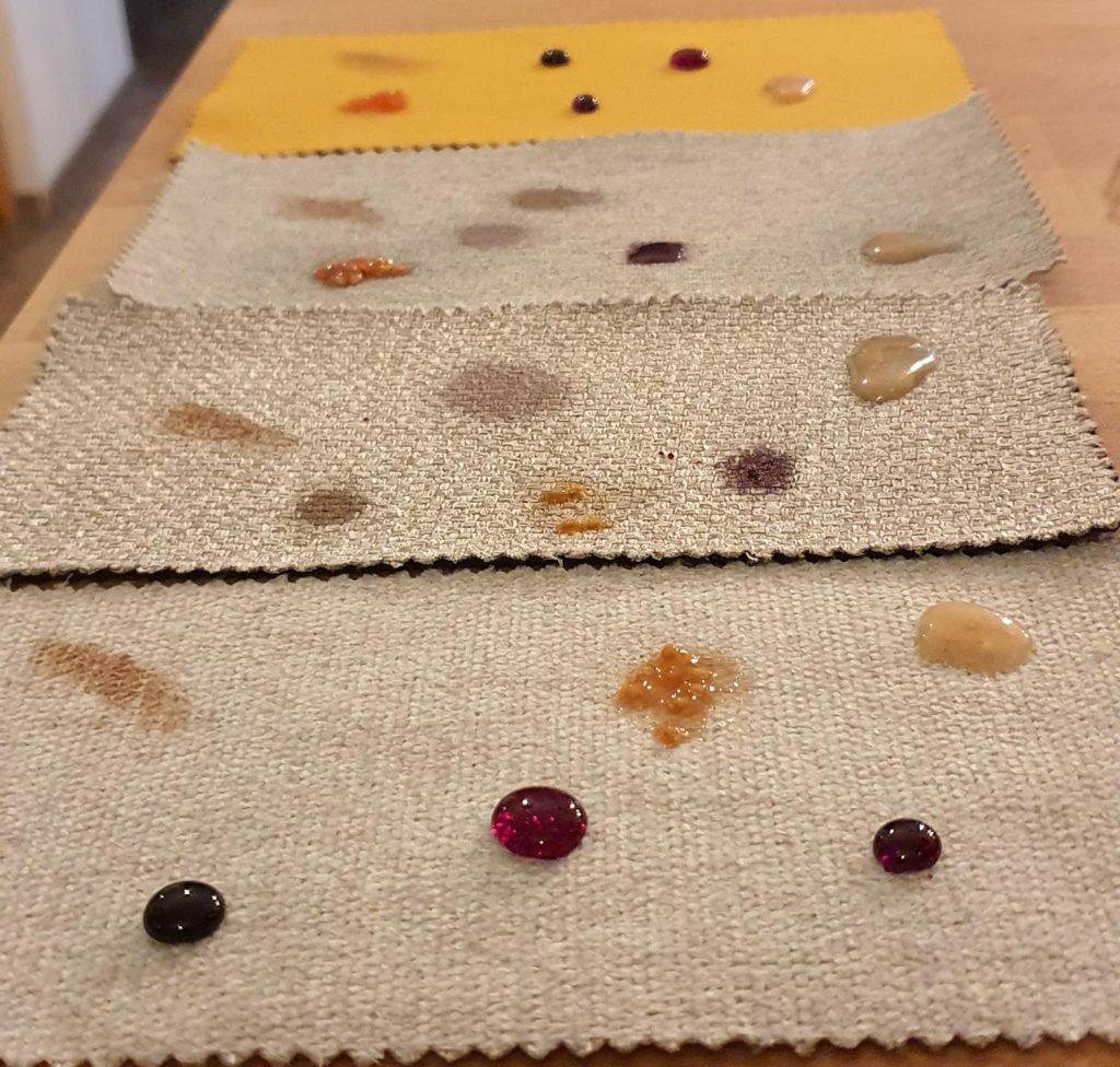 The first observations were that the ICON material did not absorb the liquids, while ZINA absorbed the liquids immediately and ALURE absorbed them more slowly. Then we left the stains to soak really well and dry overnight… This is what the stains looked like in the morning: