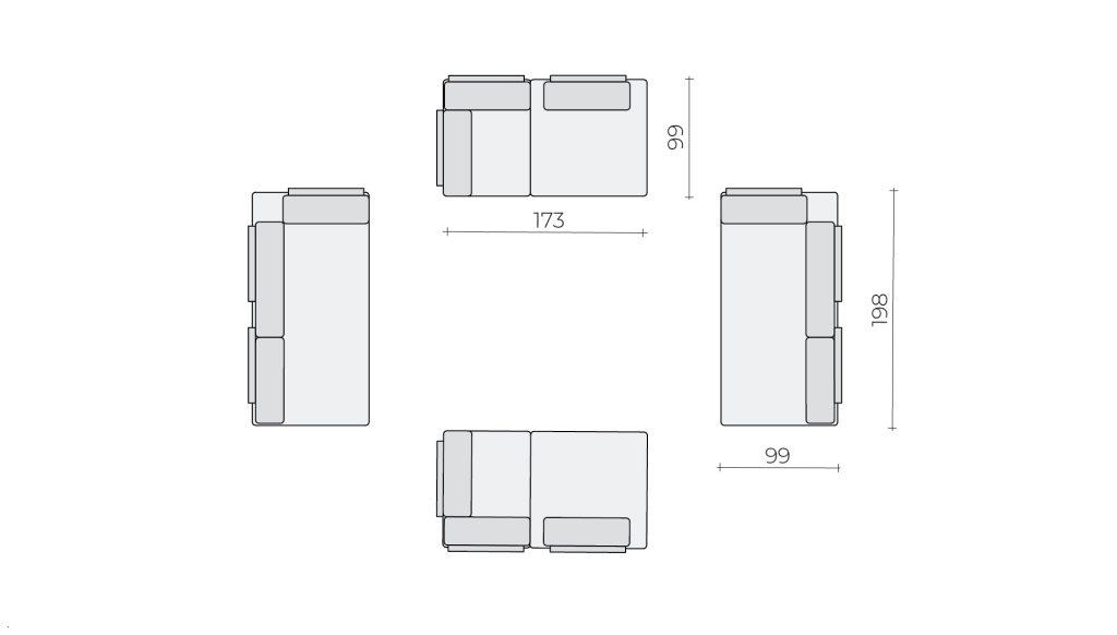 CasCais backrests can be moved along the sides of the elements. There are holes hidden under the seam on the seat elements, into which the cushion support is inserted. On the largest L element, there are holes for placing two backrests on one of the longer sides and one each on the two shorter sides. The square K element has space for one backrest on two sides and the rectangular F on one of the shorter sides. If you wish, you can also remove the backrests and store them in the storage space at the bottom of the set.